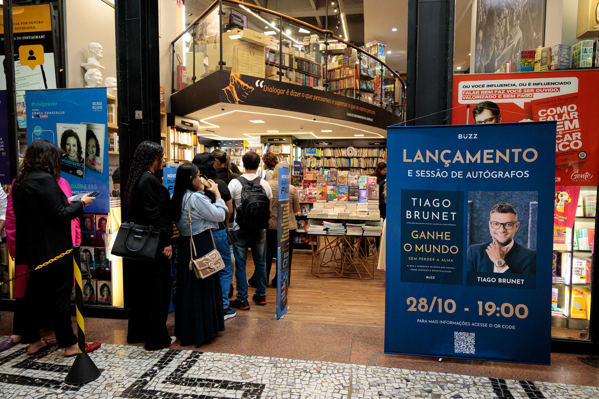 No dia 28 de outubro, estive na Livraria Drummond, no Conjunto Nacional, na Avenida Paulista, em São Paulo, para registrar a cobertura fotográfica da noite de autógrafos do livro “Ganhe o Mundo”, de Tiago Brunet, publicado pela Buzz Editora. O evento reuniu leitores, convidados e admiradores do autor em um encontro marcado por grande presença de público.