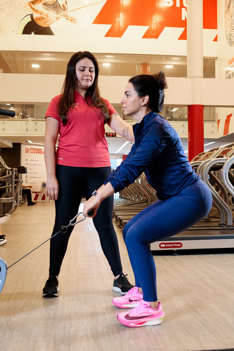 Durante a sessão, fotografei diferentes momentos das atividades dentro da academia. As imagens mostram exercícios orientados, treinos de força, aulas funcionais e momentos de acompanhamento técnico dos professores. Esse tipo de registro é importante porque evidencia algo que muitas academias buscam comunicar: a atenção individual ao aluno e a orientação correta durante os exercícios.