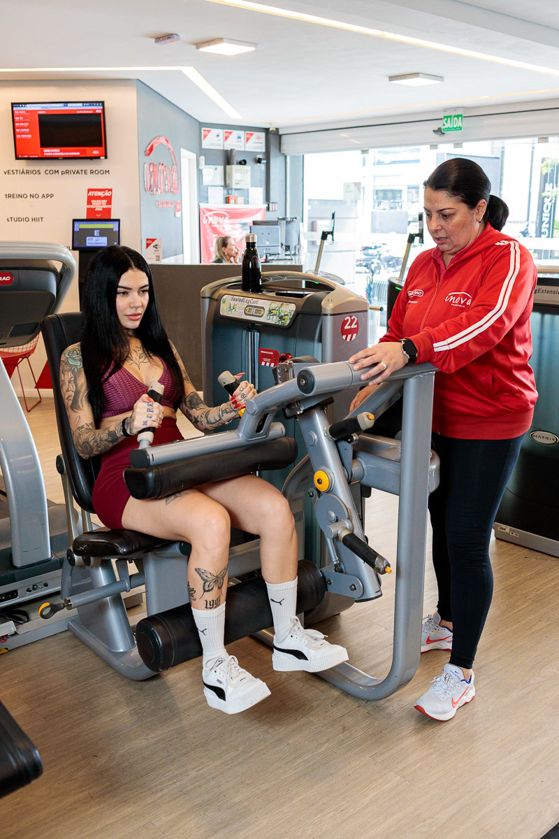 Outro ponto importante do ensaio foi valorizar os espaços da própria academia. As fotos foram feitas nos diferentes ambientes da unidade, mostrando equipamentos, áreas de treino e aulas em andamento. Isso ajuda a construir uma narrativa visual completa sobre a experiência de treinar na Academia Inova Jardim.